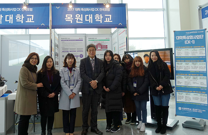 우리 대학의 CK 사업 홍보부스를 격려 방문한 대학 관계자들이 기념촬영을 하고 있다.