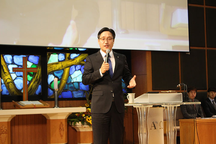 MOKWON UNIVERSITY종교개혁 500주년을 기념해 열린 신학대학 영성집회에서 한양제일교회 김종석 목사가 설교를 하고 있다.