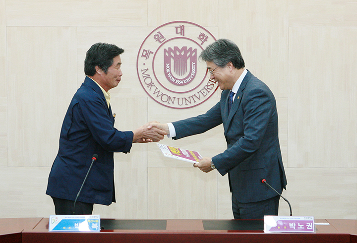 충청남도 로컬푸드 푸른밥상 직거래장터 박수복대표(사진 왼쪽)가 11일 우리 대학을 방문해 박노권총장에게 장학금 4백 만원을 전달했다.