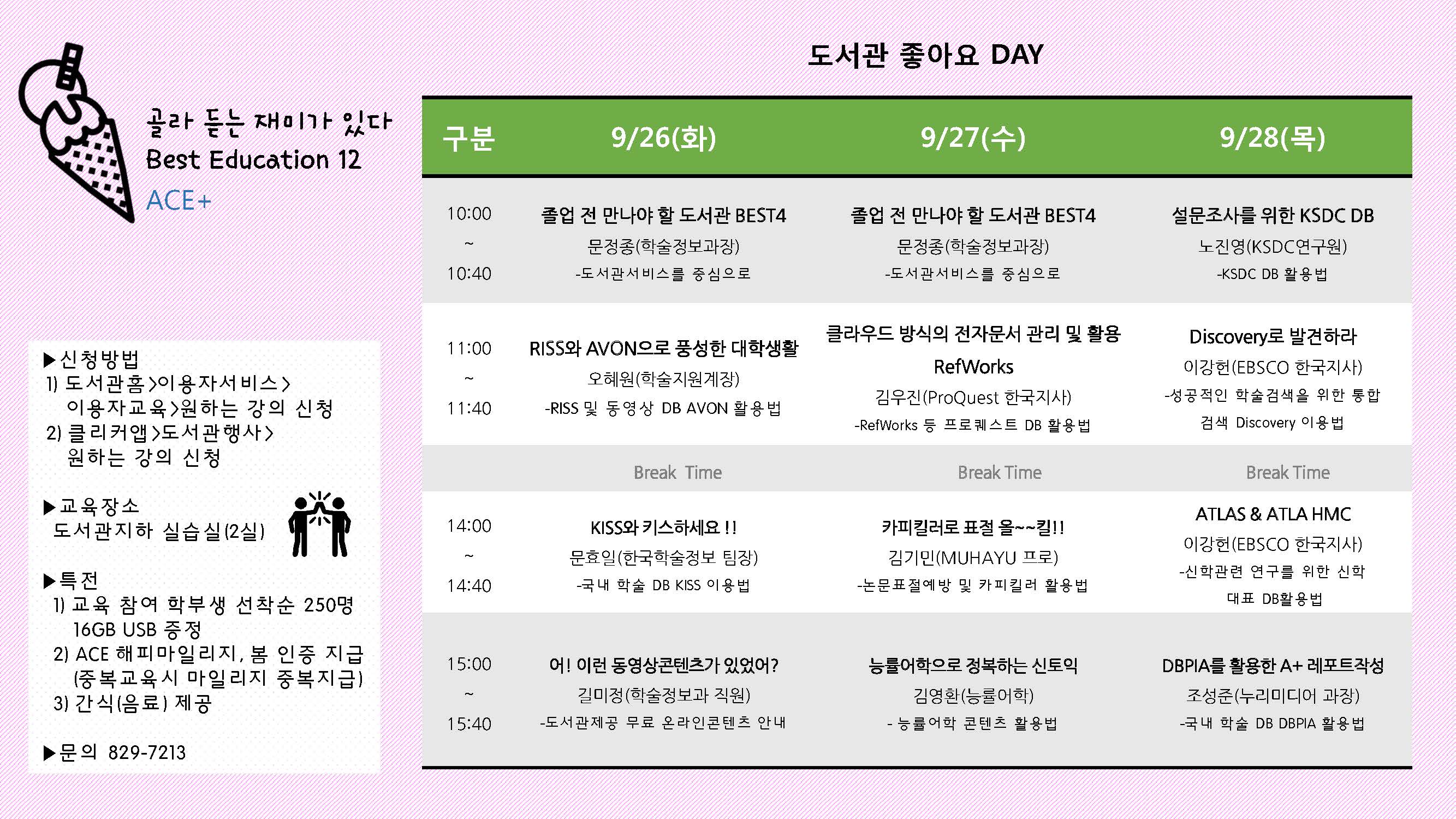 참여를 희망하는 학생은 도서관 홈페이지를 통해 신청하면 되고 학과단위 신청은 829-7213으로 전화하면 된다.