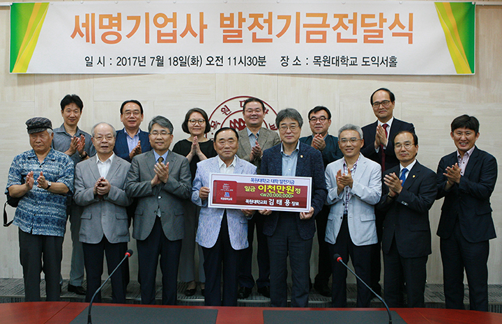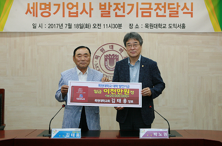 우리 대학(총장 박노권)은 18일 오전 11시 총장실에서 기부천사로 널리 알려진 ㈜세명기업사 김태용 회장(목원대학교회 장로)으로부터 대학발전기금 2천만원을 전달받았다.