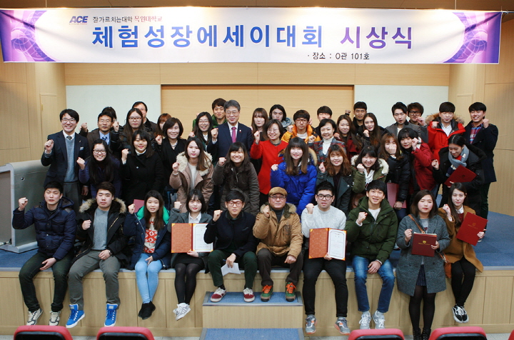 ‘체험성장 에세이대회 시상식’가져 우리대학 교양교육원이 교육부 학부교육선도대학육성(ACE)사업의 일환으로 주최하는 ‘체험성장 에세이대회 시상식’이 건축도시교육지원센터 101호에서 열렸다. 체험성장 에세이 대회는 교과목 수강을 통하여 얻은 경험과 감상을 글로 씀으로써 학생들이 자신의 생각을 정리하여 표현하면서 자신을 아는 분석적 능력과 자신의 생각을 적절하게 표현할 줄 아는 감성역량을 개발 하는 것을 목적으로 기획된 행사이다. 또한 에세이 대회를 통하여 글로 세상과 소통하는 방법을 익혀 이타적 인성역량을 높이고, 무엇보다도 학생들이 체험기반교과목을 듣고 느낀 점을 쓰고 이를 전체 목원 학생들과 나눔으로써 수상한 학생들의 자존감을 향상시키고자 마련되었다. 참가대상은 체험기반 교과목 수강생 (전공 12개 교과, 교양 7개 교과, 비교과 9개 교과) 858명 전원으로, 대회는 강의 14주차(12월 1일~ 5일)에 이루어졌다. 체험기반 교과를 수강하는 학생 중 참여를 원하는 학생들은 한 학기동안 교과목에 참여하면서 느낀 소감을 에세이로 써서 제출하도록 하였으며 많은 학생들이 에세이 대회에 참여했으며 교양교육원 언어와 표현 및 국어영역 담당교수(총 5명)들이 엄정하게 심사하였다. 대상에는 금융보험부동산학과 이동준(09학번) 학생이 선정되었으며 그 외 최우상 6명, 우수상 12명, 장려상 35명 등 총 54명이 선정되어 상장과 장학금을 수여받았다. 전체 수상자 명단은 다음과 같다. 구분 | 수상자 | 학과 | 학번 | 체험교과 | 시상내역 | 대상 (1명) | 이동준 | 금융보험부동산학과 | 0967034 | 소통을 위한 글쓰기 | 상장 및 장학금(500,000) | 최우수상 (6명) | 박희정 | 국어국문학과 | 1326018 | 인문 감성의 숲-인도 | 상장 및 장학금(각 200,000) | 이지영 | 국어국문학과 | 1326020 | 소통을 위한 글쓰기 | 이동현 | 금융보험부동산학과 | 0999034 | 인문 감성의 숲- 힐링도자 | 장하영 | 전자공학과 | 1412045 | 창의공학 설계입문 | 김예은 | 신학과 | 1310016 | 수화로 소통하기 | 정예지 | 미술교육과 | 1091025 | 미술교과교재연구법2 | 우수상 (12명) | 윤샛별 | 건반악학부 반주과 | 1289014 | 소통을 위한 글쓰기 | 상장 및 장학금(각 100,000원) | 전의정 | 경찰법학과 | 1271078 | 인문 감성의 숲-소금 | 김예슬 | 행정학과 | 1372012 | 인문 감성의 숲-적정기술의 이해 | 이유나 | 서비스경영학부 | 1195055 | 식음료론 | 전진수 | 국어교육과 | 1021023 | 인문감성의 숲-인도 | 주가람 | 영어영문학과 | 1123045 | 한국문학명작감상 | 윤경재 | 행정학과 | 0979019 | 사이버 공간과 문화 | 임연기 | 전자공학과 | 1012050 | 창의공학 설계입문 | 노경아 | 신소재화학공학과 | 1145009 | 캡스톤디자인2 | 이재성 | 행정학과 | 1112039 | 수화로 소통하기 | 정예은 | 행정학과 | 1272044 | 영화속의 역사 | 박승일 | 성악과 | 1483014 | 인문감성의 숲-한국화그리기 | 장려상 (35명) | 조다슬 | 광고홍보언론학과 | 1494069 | 소통을 위한 글쓰기 | 상장 및 장학금(각 50,000원) | 정용석 | 금융보험부동상학과 | 0967047 | 세상을 움직이는IT | 이보르미 | 미생물나노소재학과 | 1435020 | 인문 감성의 숲-한국화그리기 | 손민경 | 국어국문학과 | 1426022 | 인문 감성의 숲-힐링도자 | 윤성환 | 신학과 | 1410052 | 인문 감성의 숲- 힐링도자 | 이혜원 | 국어교육과 | 1421019 | 소통을 위한 글쓰기 | 이화영 | 경제학과 | 1463037 | 세상을 움직이는 IT | 안태영 | 정보통신융합공학부 | 1246017 | 인문감성의 숲-3D 캐리커쳐 | 지요한 | 역사학과 | 0909029 | 인문 감성의 숲-통기타배우기 | 류성환 | 융합컴퓨터미디어학부 | 0951016 | 세상을 움직이는 IT | 김예정 | 미술교육과 | 1191010 | 미술교과교재 연구법 2 | 김정아 | 국어국문학과 | 1126009 | 한국문학 명작 감상 | 김언효 | 무역학과 | 1162014 | 사이버 공간과 문화 | 윤송이 | 미술학부 서양화 | 1390010 | 사이버 공간과 문화 | 박지영 | 서비스경영학부 | 1495027 | 인문 감성의 숲-통기타배우기 | 오은하 | 광고홍보언론학과 | 1394048 | 영화속의 역사 | 백승재 | 전자공학과 | 1412022 | 창의공학설계입문 | 황영준 | 전자공학과 | 1412051 | 창의공학설계입문 | 김미리 | 신소재화학공학과 | 1145005 | 캡스톤 디자인2 | 이솔 | 신소재화학공학과 | 1145023 | 캡스톤 디자인2 | 송주영 | 컴퓨터교육과 | 1156013 | 인문감성의 숲-젬베 | 박현미 | 신학과 | 1210031 | 수화로 소통하기 | 오제혁 | 행정학과 | 1472033 | 인문감성의 숲-한국화그리기 | 김형태 | 미술학부 기독교미술전공 | 1075006 | 소통을 위한 글쓰기 | 박내홍 | 서비스경영학부 | 1195024 | 식음료론 | 박준섭 | 신소재화학공학과 | 1445006 | 기독교의 이해 | 조하랑 | 국어교육과 | 1421025 | 기독교의 이해 | 정재혁 | TV 영화학부 | 1099051 | 한국문학명작감상 | 이승욱 | 금융보험부동산학과 | 1110060 | 인문감성의 숲-인도 | 박수경 | 미생물나노소재학과 | 1435008 | 인문감성의 숲- 한국화 | 박수현 | 미술교육학과 | 1291007 | 인문감성의 숲- 한국화 | 김경국 | TV 영화학부 | 0999005 | 인문감성의 숲- 한국화 | 이효진 | 국어국문학과 | 1226030 | 인문감성의 숲- 기타 | 김효정 | 사회복지학과 | 1218019 | 인문감성의 숲- 김효정 | 홍성민 | 서비스경영학부 | 1058034 | 식음료론 |