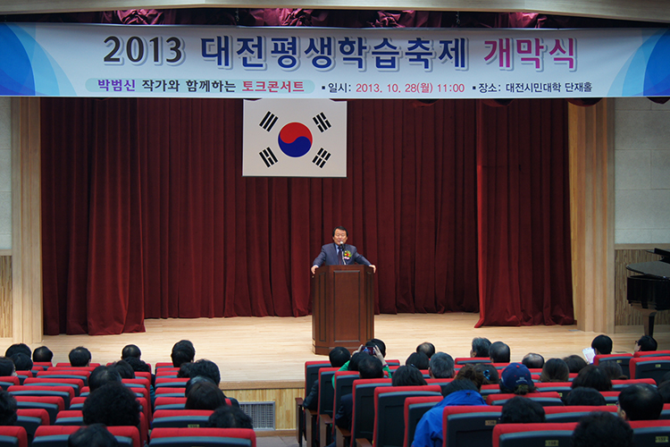 대전평생교육진흥원(원장 연규문)이 주최하는 2013 대전평생학습축제가 대전시민대학 대강당에서 개막식을 시작으로 10월 28일(월)에서 31일(목)까지 나흘간의 일정에 들어갔다. 이번 개막식에는 우리대학 김원배 총장을 비롯한 염홍철 대전시장과 대전시의회 의장, 대전시 교육감, 5개 구청장, 평생교육관련 기관 및 단체 등이 참석하였으며 개막식이 열리고 풍물단의 길놀이, 어울림합창단의 축하공연과 개막 기념행사와 박범신 작가 초청 토크 콘서트도 진행되었다. 오는 31일(목)까지 계속되는 이번 축제는 대전시민대학 및 원도심 일원에서 ‘행복을 만드는 평생학습’을 주제로 열리며 각종 평생학습 체험, 작품전시, 경연대회, 세미나는 물론 제1회 대전평생학습 사진 공모전, 교수들이 꾸미는 작은 음악회 등 다양한 프로그램이 선보일 예정이다.
