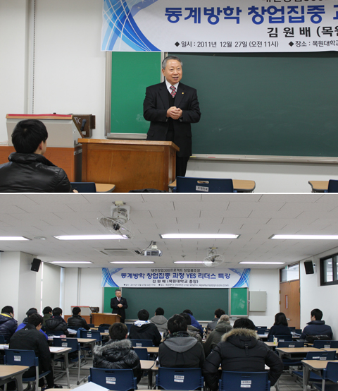 우리 대학 김원배 총장은 12월 27일(화) 오전 11시 사회과학대319호에서 창업집중과정을 특강 하였다. 김원배 총장은 학생들에게 “대학창업300프로젝트 창업집중과정”으로 체험형 교육과정 및 팀별 프로젝트 활동을 통해 잠재 사업 아이템 발굴 등을 설명하였다.