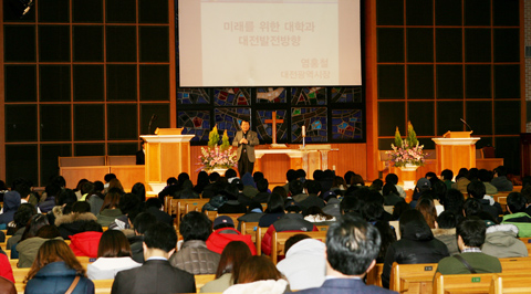 11월 29일(화) 오전 9시 30분부터 우리 대학 채플에서는 700여명의 학생들이 참여한 가운데 염홍철 대전시장을 초청하여 ‘미래를 위한 대학과 대전발전 방향’이라는 주제로 1시간 동안 특별강연이 진행되었다.