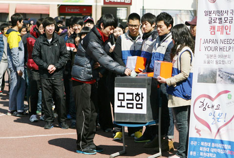 학생회관 광장에서는 3월 17일(목) 오전 11시부터 총동아리연합회 임원과 RCY(청소년적십자) 동아리 회원 등 30여명의 학생들이 일본의 지진으로 인한 대참사 피해를 돕기 위한 본격적인 모금 활동을 펼친다.