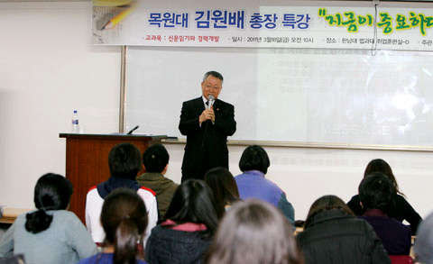 김원배 총장은 3월 18일(금) 오전 10시~11시 한남대학교 취업훈련실 D전용강의실에서 ‘지금이 중요하다, 신문을 읽자’ 라는 주제로 특강을 하였다. 김 총장은 특강을 통하여 한남대 취업 교양과목으로 개설된 ‘신문읽기와 경력개발’ 강좌에서 학생들에게 신문읽기에 대한 장점을 설명하였다.