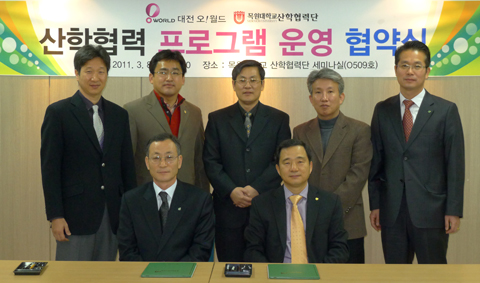 우리 대학교(총장 김원배)는 3월 8일(화) 오전 10시 목원대 산학협력단(단장 박태근) 세미나실에서 대전오월드(원장 우석형)와 산학간 협력을 위한 ‘맞춤식 현장실습 프로그램’ 지원 사업을 위한 협약을 체결하였다.