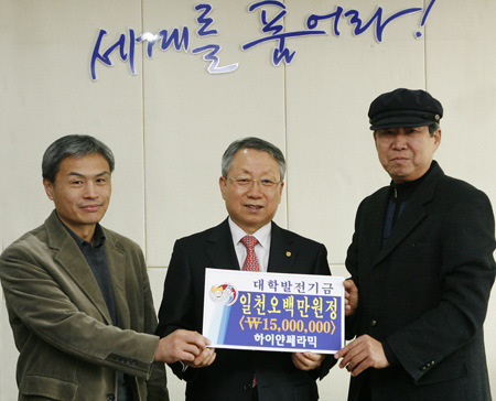 12월 15일(수) 오후 4시 김원배 총장은 본부 회의실에서 본교 미대 도자디자인학과에서 설립한 학과 기업인 ‘하이얀 세라믹(대표 안병국 도자디자인학과 교수)’ 측으로부터 1천5백만원의 장학금을 전달받았다.