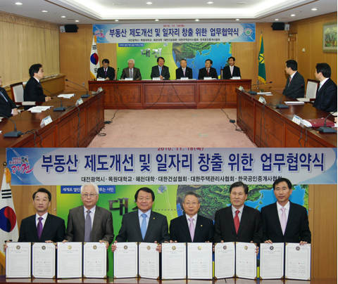 11월 18일(목) 대전광역시청에서는 우리대학 김원배 총장을 비롯하여 염홍철 대전광역시장, 혜천대학총장, 대한건설협회 대전광역시회장, 한국공인중개사협회 대전광역시지부장, 대한주택관리사협회 대전광역시회장 등이 참석한 가운데 부동산 제도개선 및 일자리 창출을 위한 부동산관련 기관 간 상호 협력 체계를 구축하는 협약식을 체결하였다.