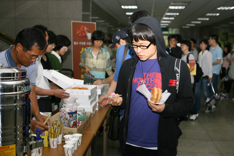 아침에 빵과 우유를 받아든 이한나(사회복지학과 3학년)학생은 “자취생이라 이곳에서 아침을 때우려고 허둥지둥 학교로 달려왔는데 이렇게 줄이 길 줄은 몰랐다”라며 “준비해 준분들께 너무 고맙고 시험 잘 봐서 장학금 타면 밥 살께요”라고 환한 웃음을 지었다.