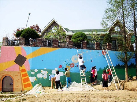 학생들은 양로원에 계신 여러 어르신들에게 조금이나마 따뜻함을 느끼게 해드리기 위해 밝은 색깔의 꽃들과 양떼 풍차와 같은 자연물로 그림의 주제를 정하고 높은 곳은 사다리를 이용하여 벽화작업을 하였다.