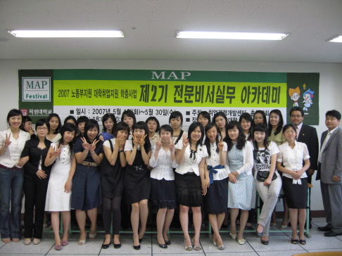 목원대학교가 『2007년 노동부 지원 대학 취업지원기능 확충사업』에 선정된 바, 취업경력개발센터에서는 5월 2일부터 30일 까지 총 5주 동안 진행된 『제 2기 전문비서실무 아카데미』의 수료식을 5월 30일 수요일 저녁 6시에 모의 면접과 함께 사회과학대학 516호 강의실에서 진행되었습니다.