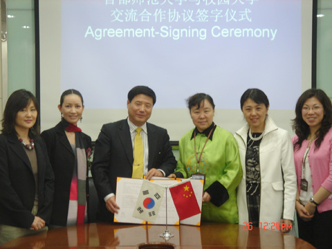 목원대학교(牧園大學校)와 북경수도사범대학교(中國首都师范大学校)는 4월 26일(수) 오전 11시 북경수도사범대학교 국제문화대학 국제회의실에서 호혜평등과 우호협력의 원칙으로 학생교류, 교수교류, 그리고 학술 및 문화교류를 증진하기 위하여 우호관계를 맺고 협력협약서를 체결하였습니다.