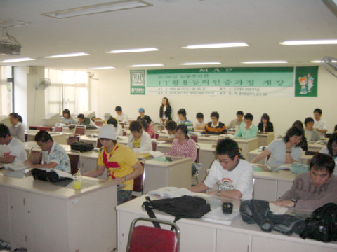 올 3월 초 『노동부 지원 대학 취업지원기능 확충사업』에 선정되어 학생처 취업정보실 주최로 5월 1일부터 5월 16일까지 10일 간 진행된 ""IT 활용능력인증과정""은 취업대비 정보화 교육으로 IT e-Business 관련 지식에서부터 정보 분석, 활용까지 정보화 사회에서 요구되는 정보활용 능력을 종합적으로 배우고 측정할 수 있는 기회가 되었습니다.