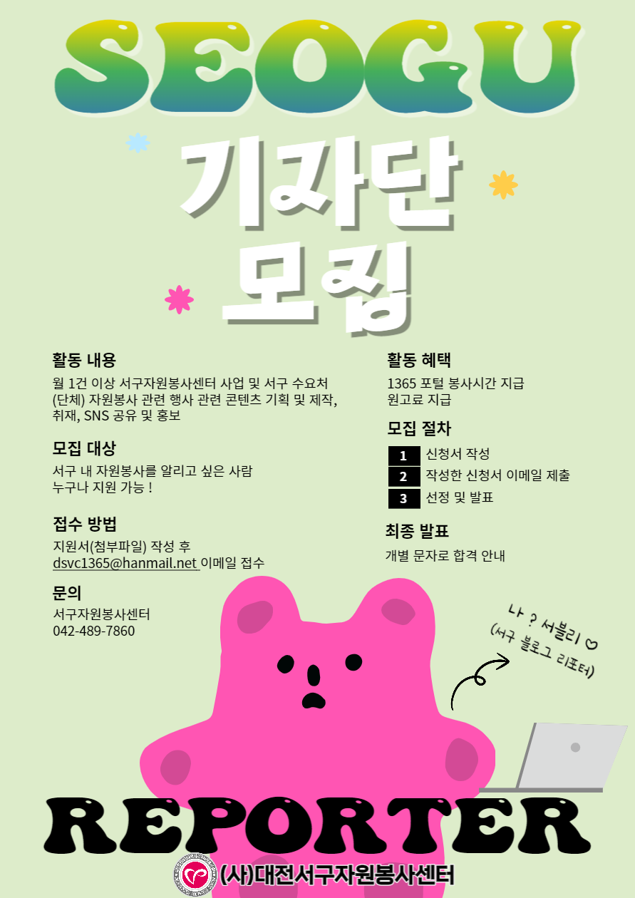 - 자원봉사 관련 축제 및 행사, 수요처(단체)의 홍보 및 모집 등을 취재 후 센터 카페, 블로그 및 SNS(인스타그램, 페이스북) 게재