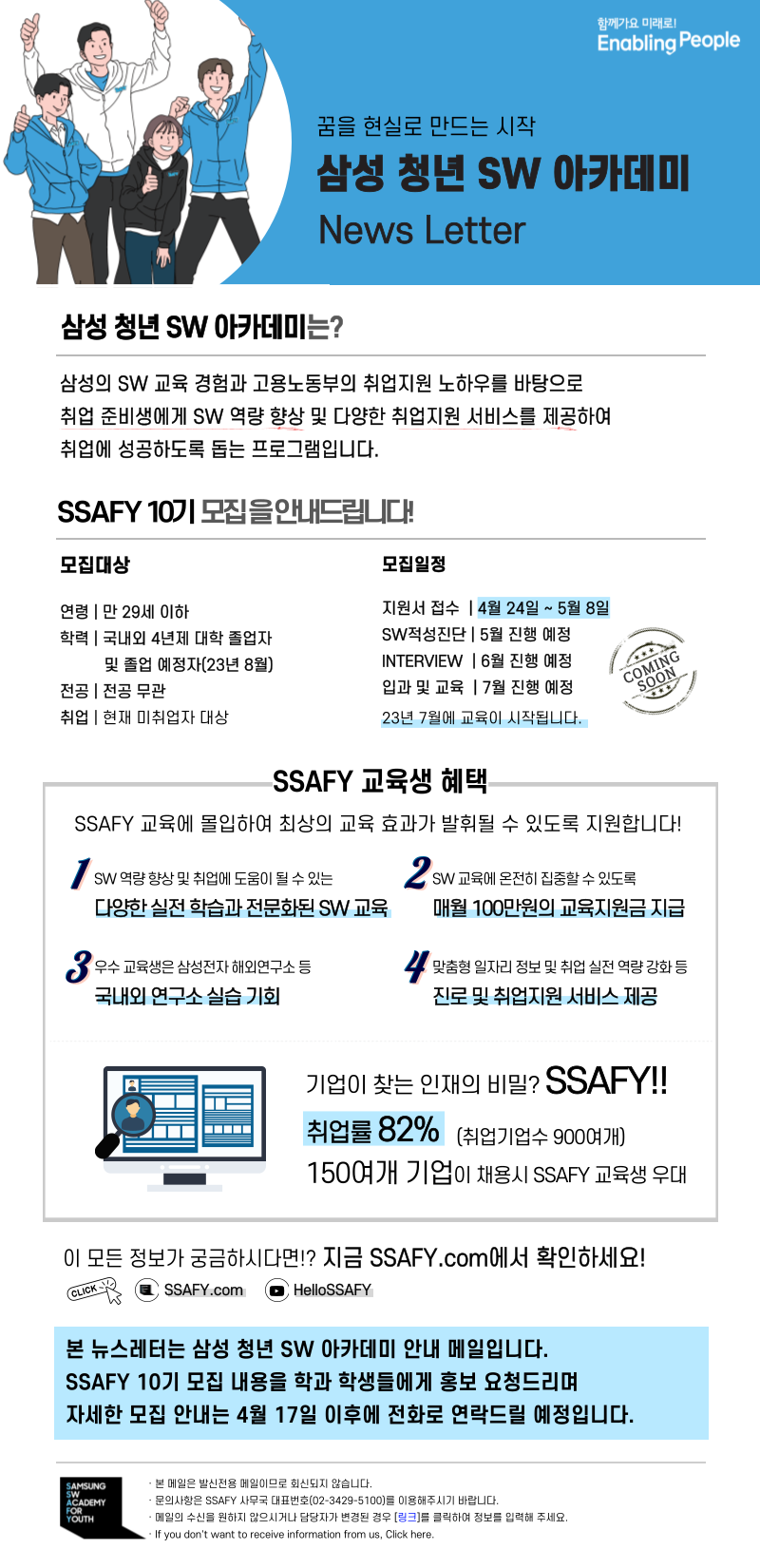 삼성 청년 SW 아카데미 SSAFY 10기 교육생을 모집