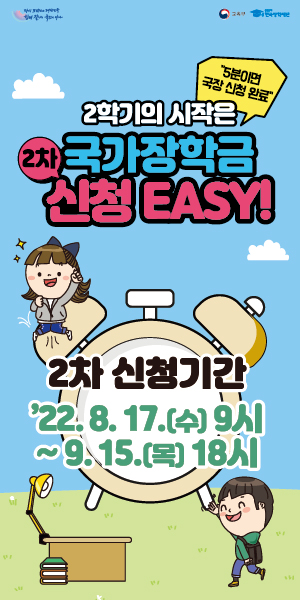 세계로 미래로 비상하는한국장학재단에서는 2022년부터 대학생의 실질적 반값등록금 실현을 위해 국가장학금 연간 지원금액 및 지원대상이 확대됨에 따라 대학생들이 교육비 부담을 경감하여 학업에 전념할 수 있도록 국가장학금 신청에 대한 홍보를 강화하오니 해당 학생들은 많은 신청 바랍니다.