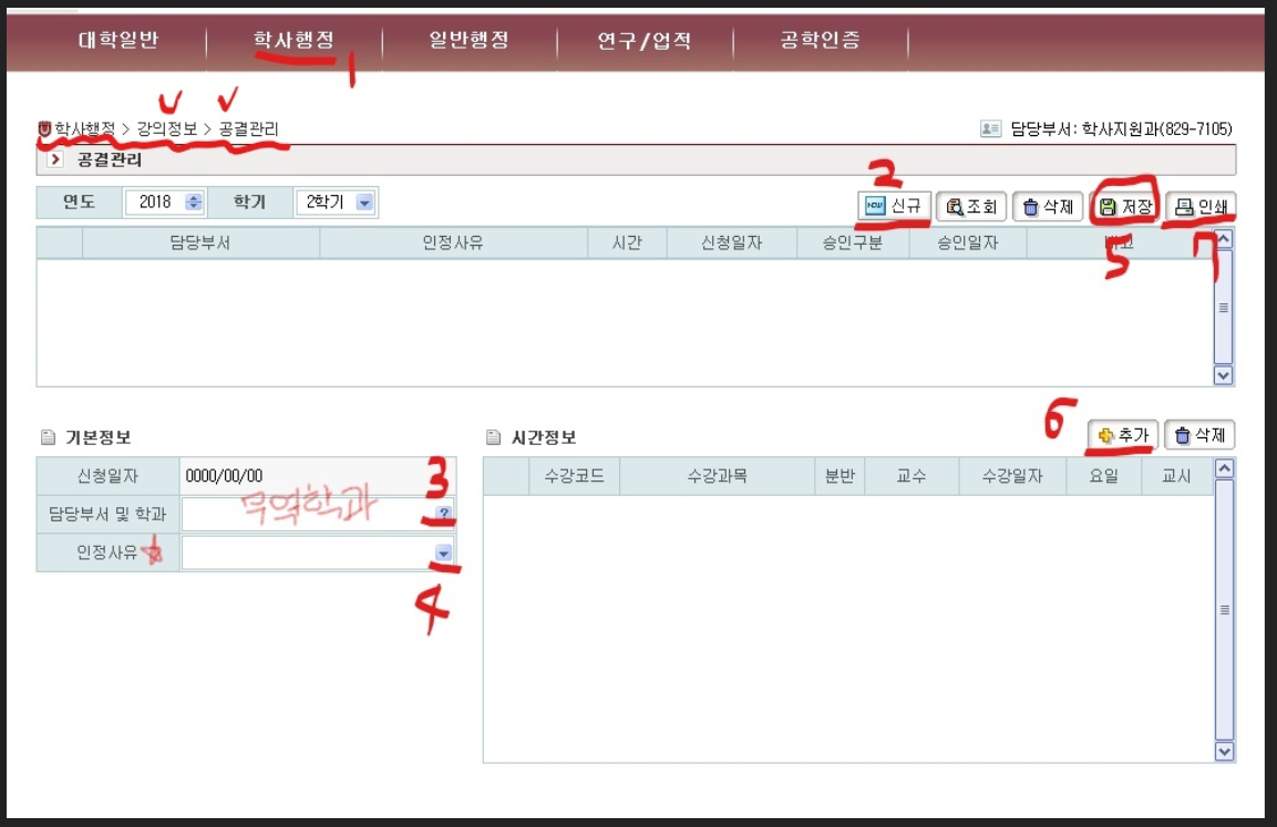 2. 출석인정신청서 (종합정보시스템 공결관리에서 전체 과목 선택하여 출력해오기)