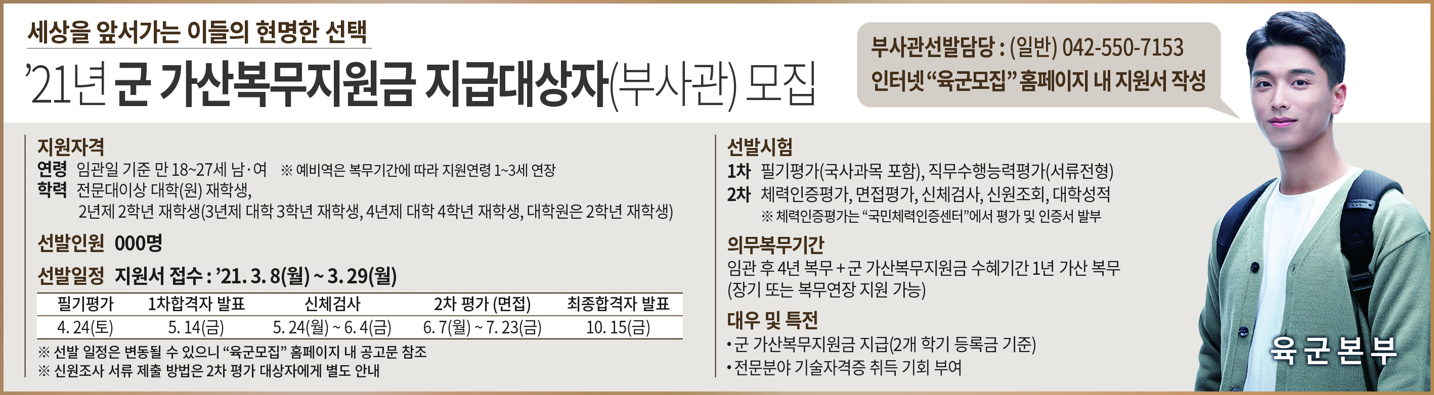 2. '21년 군 가산복무지원금 지급대상자(부사관) 모집 이미지(신문/포스터/배너) 각 1부. 끝.