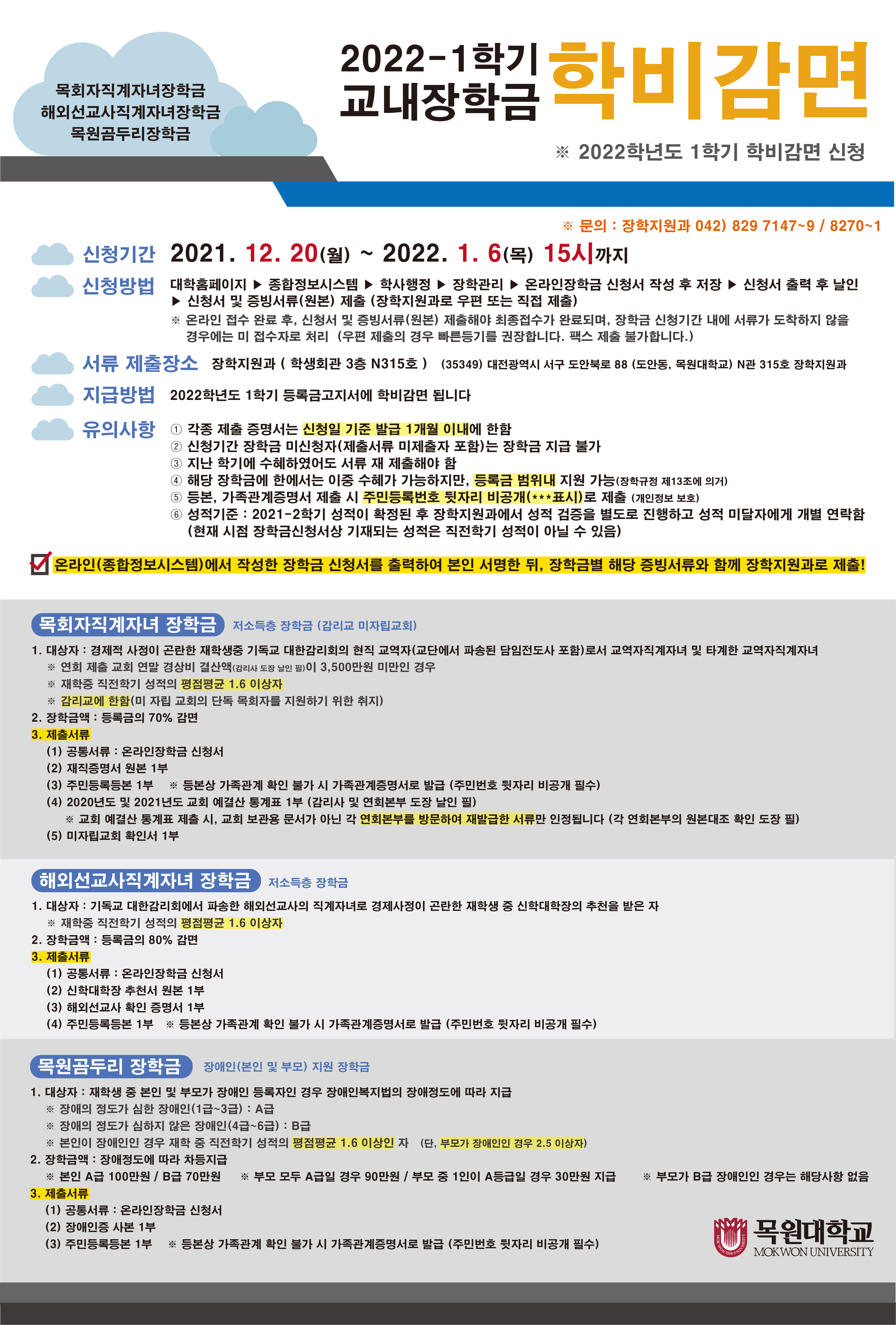 ◉ 교육자직계자녀장학금 · 목원가족장학금 · 사회봉사장학금 : 학기 중 접수 예정 (2022년 3~4월 중 신청안내 예정 → 신청자격 확인 후 후불 지급)