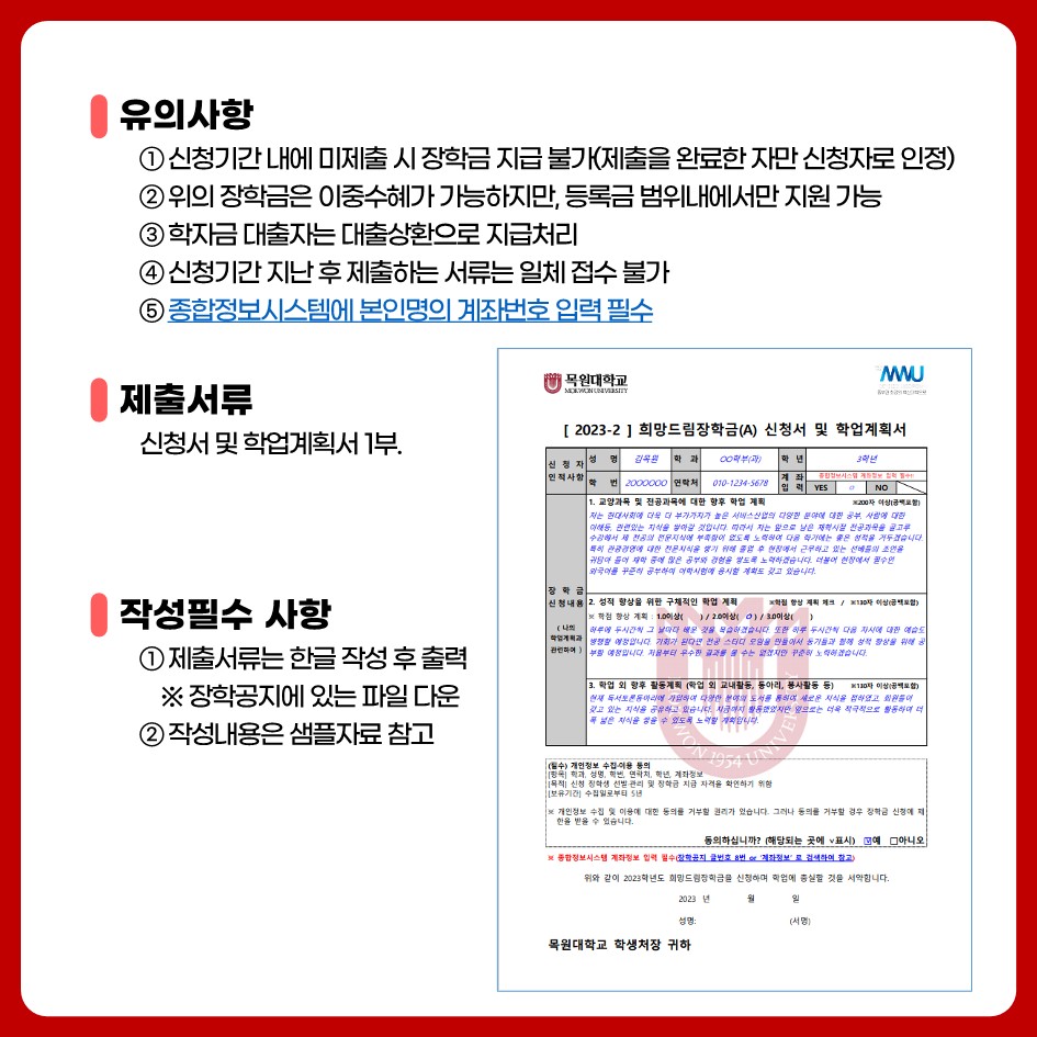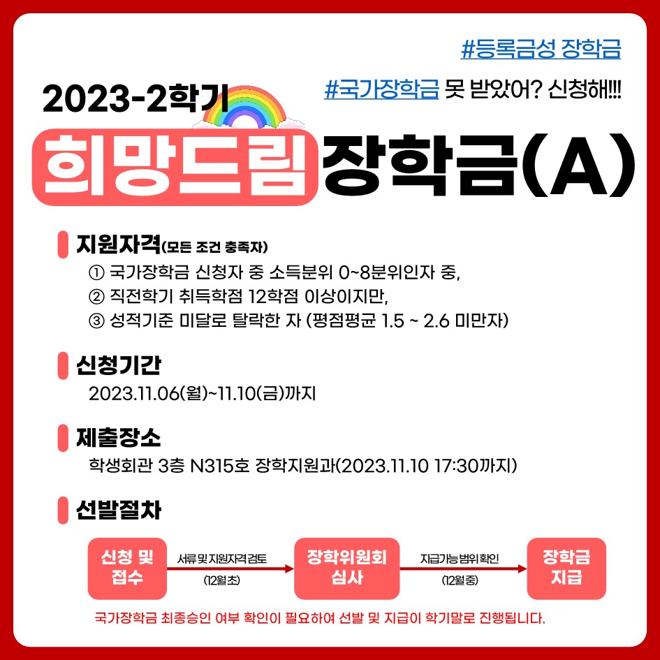 3. 신청방법: 본교 홈페이지 장학공지 내 희망드림장학금(A) 공지사항 접속 ▶ 신청서 및 학업계획서 다운로드 후 작성 (수기작성 불가, 컴퓨터로 작성) ▶ 장학지원과로 직접 제출 또는 우편 제출(학생회관 3층 장학지원과 N315)
