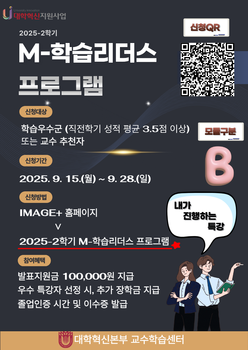 4. 신청방법: 학생역량&경력개발 시스템>역량개발>비교과 프로그램 신청>2025-2학기 M-학습리더스 프로그램(또래강사 모집)