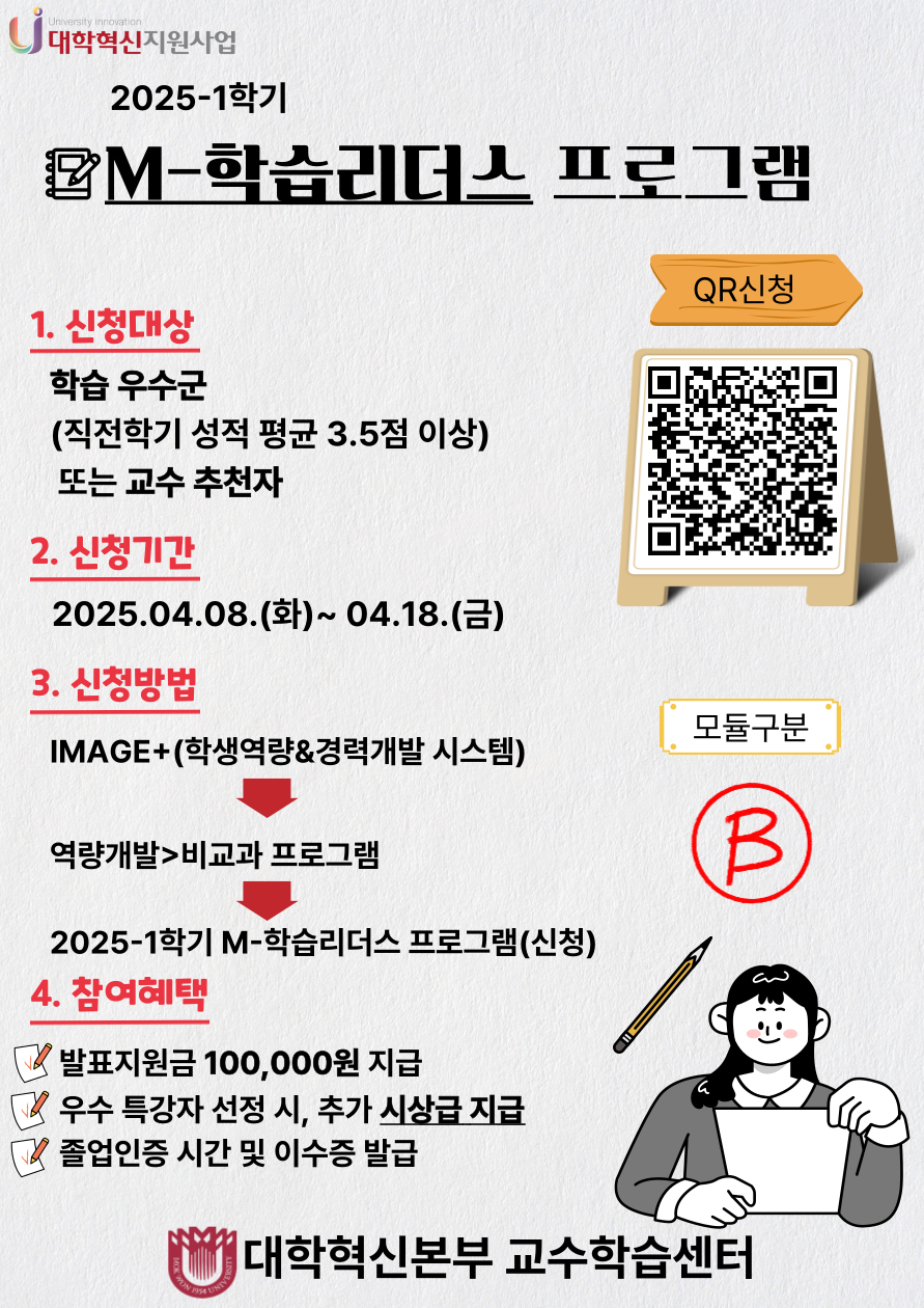 4. 신청방법: 학생역량&경력개발 시스템>역량개발>비교과 프로그램 신청>2025-1학기 M-학습리더스 프로그램(또래강사 모집)