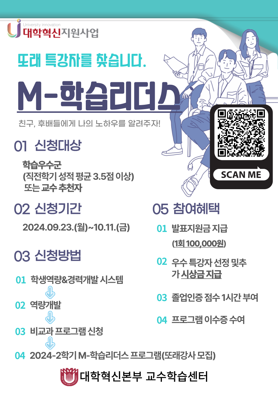 4. 신청방법: 학생역량&경력개발 시스템>역량개발>비교과 프로그램 신청>2024-2학기 M-학습리더스 프로그램(또래강사 모집)