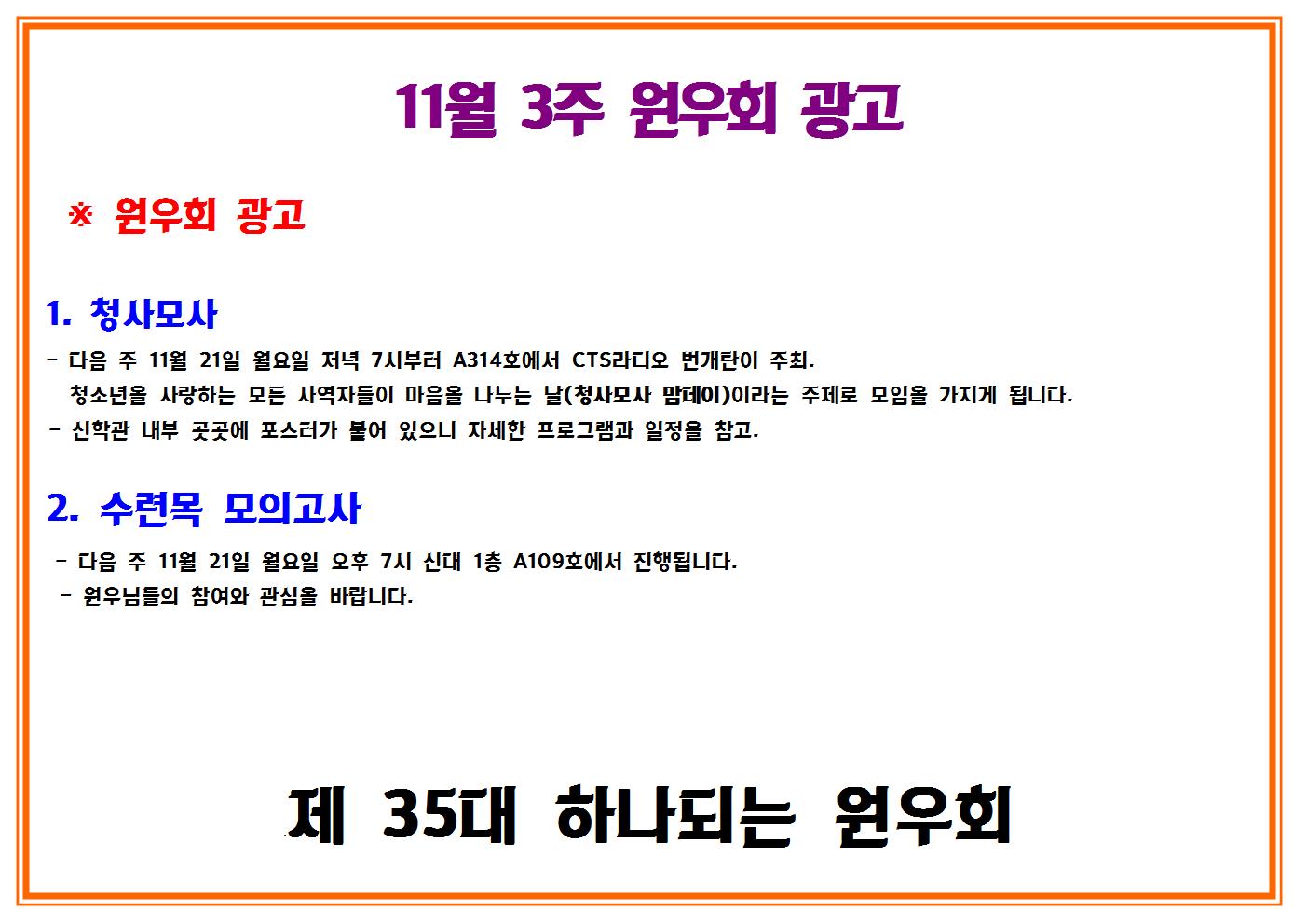 WESLEY GRADUATE SCHOOL OF사무실 광고입니다. 1. 이번 주 금요일 종합시험(재시험)이 있습니다. 2. 2017학년도 전기 신입생 원서접수 기간이 11월 14일 월요일부터 25일 금요일까지입니다. 전형일은 12월 2일 금요일입니다. 많은 관심 부탁드립니다. 3. 성경고사 신청기간이 11월 21일 월요일부터 24일 목요일까지입니다. 3층 게시판을 참고하여 주시기 바랍니다. 원우회 광고입니다. 1. 청사모사 관련 안내입니다. - 다음 주 11월 21일 월요일 저녁 7시부터 A314호에서 CTS라디오 번개탄이 주최하는 청소년을 사랑하는 모든 사역자들이 마음을 나누는 날(청사모사 맘데이)이라는 주제로 모임을 가지게 됩니다. - 다음 세대, 특히 청소년을 사랑하고 준비하시는 모든 원우님들에게 유익한 시간이 될 것입니다. 신학관 내부 곳곳에 포스터가 붙어 있으니 자세한 프로그램과 일정을 참고하시어 많은 원우님들의 참여를 바랍니다. 2. 수련목 모의고사 관련 안내입니다. - 다음 주 11월 21일 월요일 오후 7시 신대 1층 A109호에서 진행됩니다. 3. 감리교 교육국에서 진행하는 2017년 공과 교재 설명회가 다음 주 화요일 낮 12시부터 1시까지 A314호 구 채플실에서 진행됩니다. 원우님들의 많은 참여를 바랍니다. 4. 2017년 36대 원우회 선거관련 안내입니다. - 제 36대 원우회 선거 관련하여 다음 주 수요일 채플예배 후 학견 발표가 있습니다. * 글 정렬이 제대로 올려지지 않아 첨부파일을 참고하시면 깔끔하게 보실 수 있습니다.