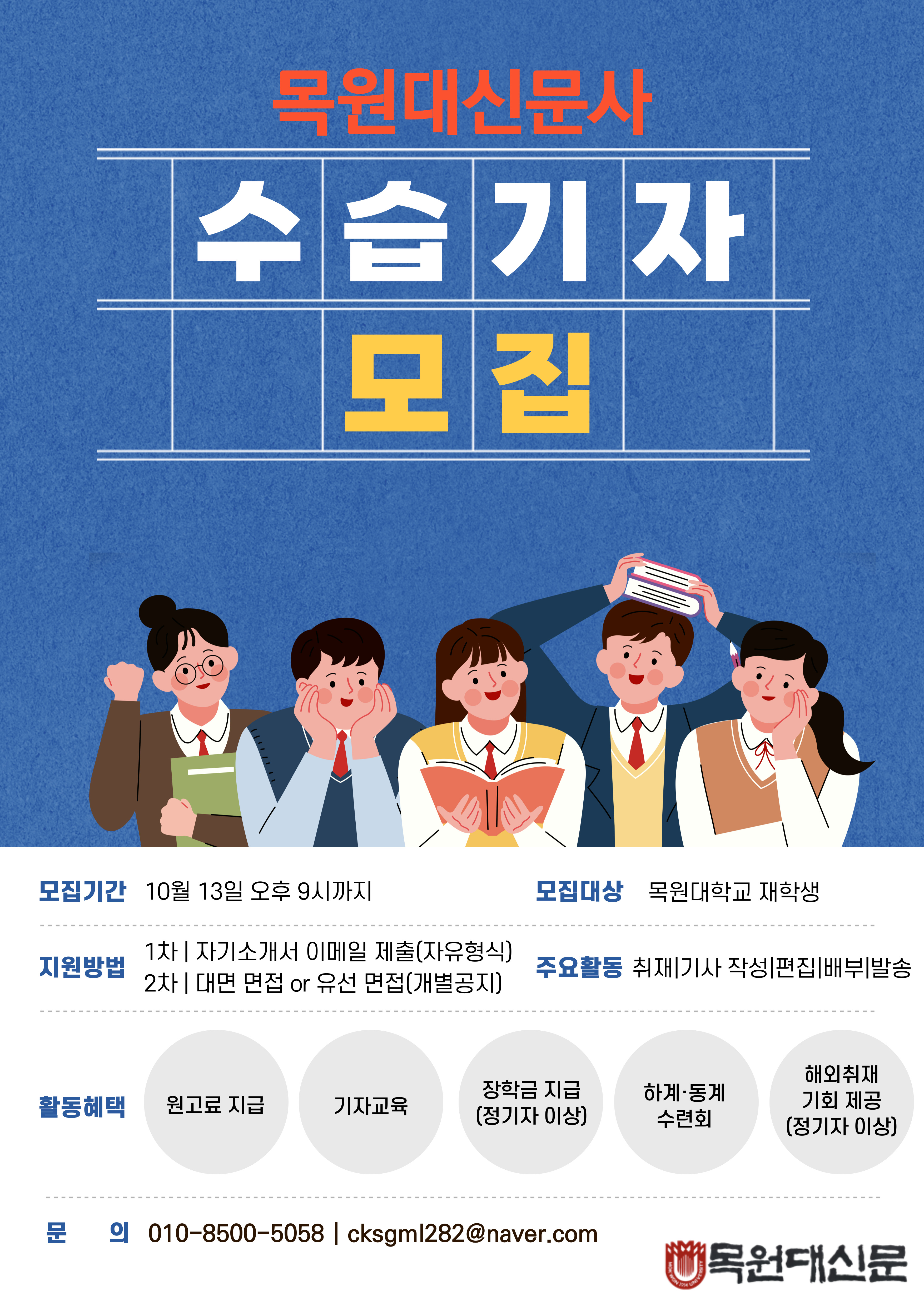 안녕하세요 목원대신문사 편집장 이찬희입니다. 이번에 수습기자를 모집하고 있습니다. 우리대학 재학생이라면 지원이 가능하니 많은 참여부탁드립니다. 홍보 포스터 참고하여주세요! 추가로 궁금한사항 있으면 과사로 문의주세요!